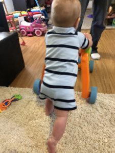 Eating: Drinking 26 oz of formula each day. He has fruit and oatmeal for breakfast, veggies, and chicken for lunch and whatever we are eating for dinner. And he loves puffs! He’s getting a lot of fiber and poops at least 4 times per day.